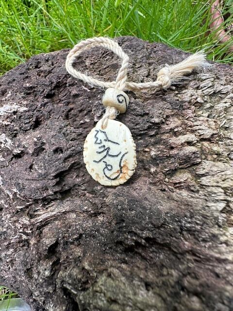 ♦鹿の角の根本部分に神様の文字で 「叶う」と彫り込んでいます。 鹿の角は古くより財運、勝負運、災い除けとしての 縁起があります。 ♦サイズ 縦:3,3cm 横:2,7cm ※合掌した掌の中に入れて祈ると 願いが叶うとも云われています。 ※紐は麻を編みました。
